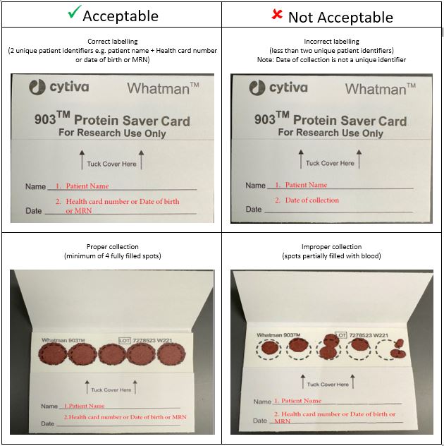 - DBS cards with spots not fully delineated with blood will be rejected.